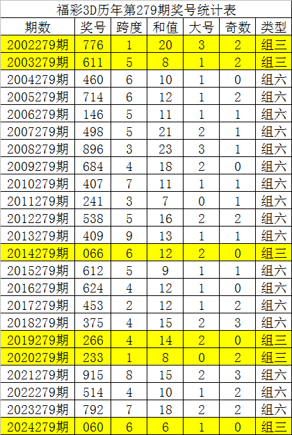 福彩3D历年第279期同期分别开出奖号:776、611、460、714、146、498、896、684、407、241、538、409、066、612、624、453、375、266、233、915、514、792、060,详细统计见下表: