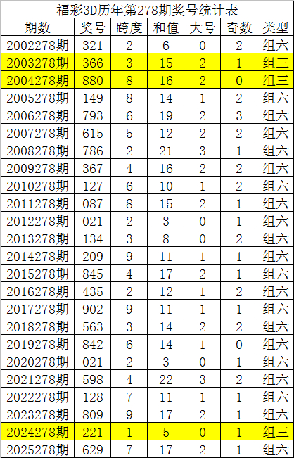 从以上统计可以看出,历年3D第279期开出了6次组三号码,开出了17次组六号码。组六号码出现概率大,本期预计开出组六号码。